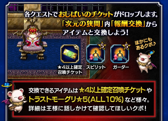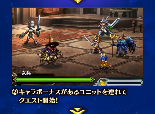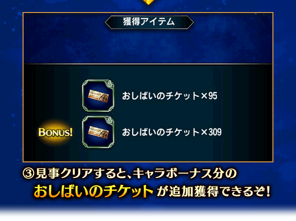 パーティにベアトリクス、エーコ、スタイナー、黒のワルツ3号がいる場合は、おしばいのチケット獲得量にボーナスが上乗せされるぞ!