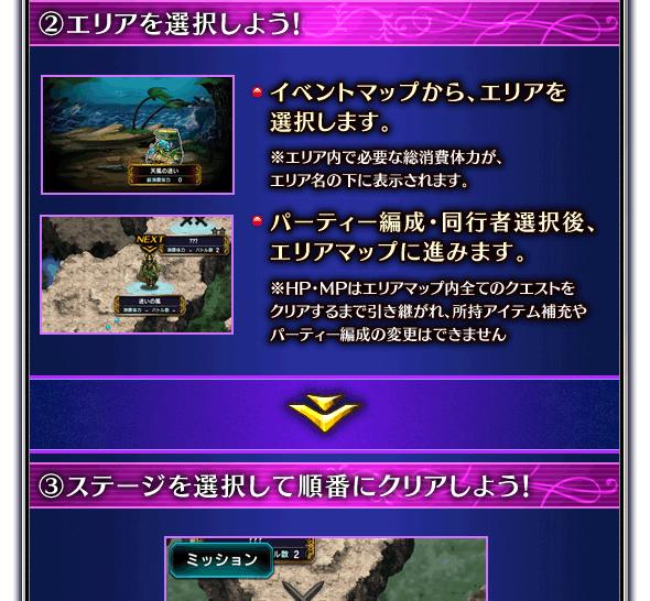 更新日:2017-04-10 22:15:00ストーリーイベントでは、イベント専用のマップがあり、その中にたくさんのエリアが存在します。