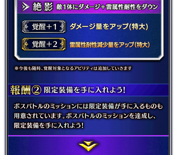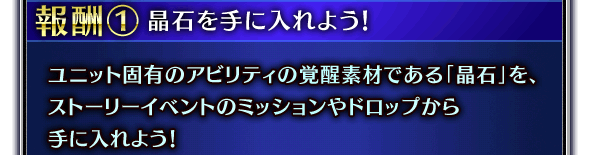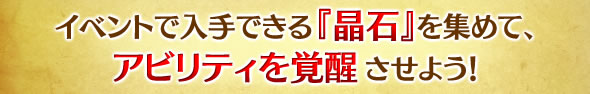 また、イベント中にあるバトルステージのミッション報酬や、敵が落とすドロップアイテム等からアビリティ覚醒に必要な『晶石』を入手することできます。