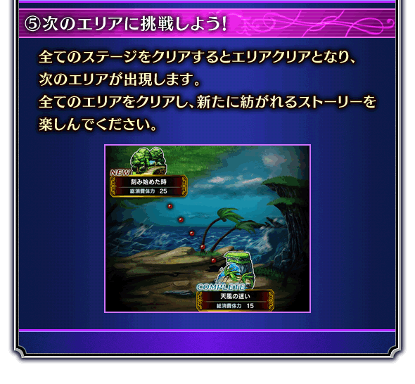 エリアの中にはバトルで敵を倒すバトルステージと、シナリオが発生するシナリオステージがあり、順番にクリアしていきます。全てのステージをクリアすると、そのエリアはクリアとなり、次のエリアに進むことができます。エリア全てのクリアを目指しましょう。