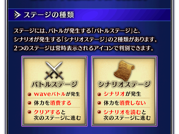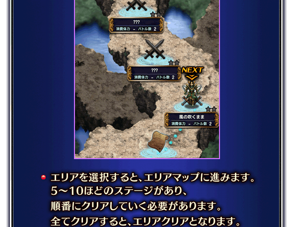 エリアの中にはバトルで敵を倒すバトルステージと、シナリオが発生するシナリオステージがあり、順番にクリアしていきます。全てのステージをクリアすると、そのエリアはクリアとなり、次のエリアに進むことができます。エリア全てのクリアを目指しましょう。