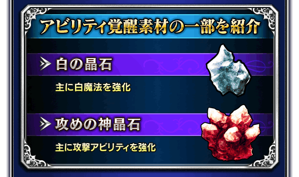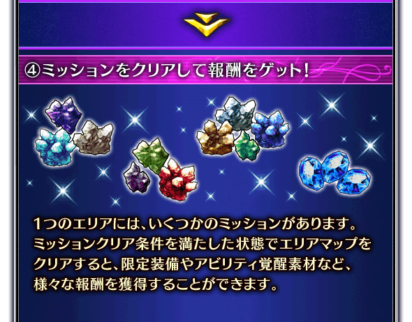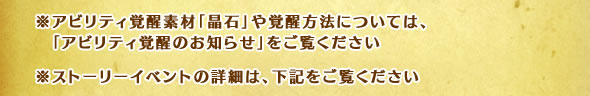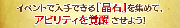 また、イベント中にあるバトルステージのミッション報酬や、敵が落とすドロップアイテム等からアビリティ覚醒に必要な『晶石』を入手することできます。