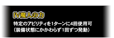 敵全体に一部魔法防御無視ダメージ+火・土・闇属性耐性をダウン+ 自分の魔力ダウン効果を解除+ 2ターン「IV魔人の力」が使用可能 ![]() | |
